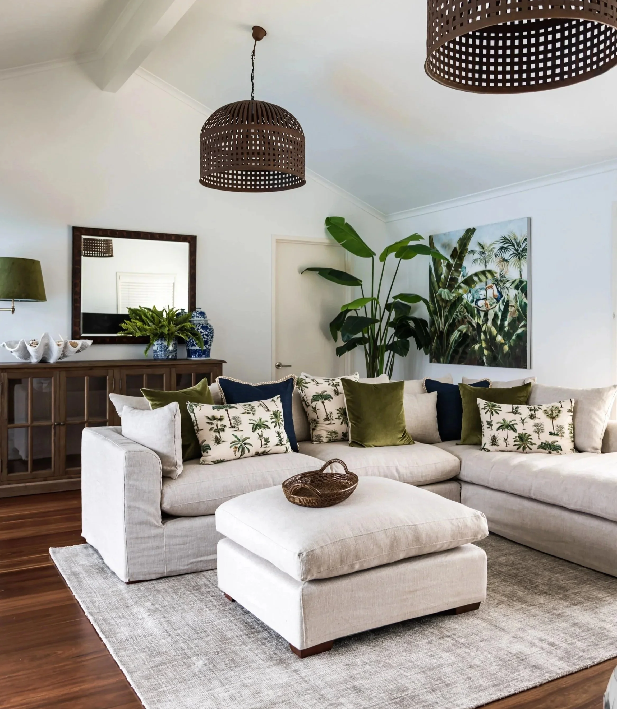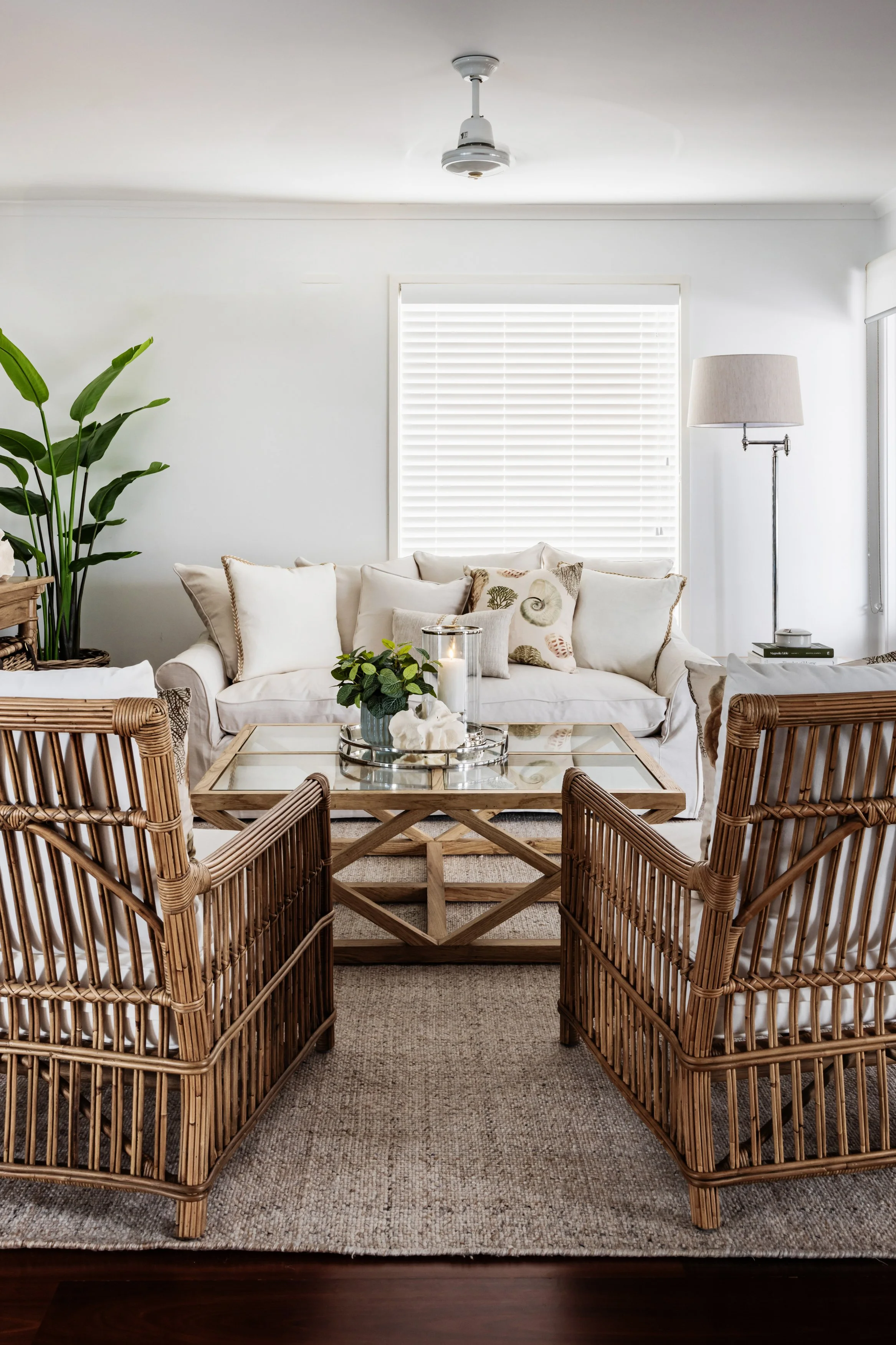 Our brief was to create a coastal tropical home layered with relaxed elegance. The main living area was styled with a soft, feminine palette to evoke a calm and welcoming retreat, while signature blue and white ceramic accents and lush greenery add freshness and visual interest throughout. Natural linen textiles are paired with oak and rattan furniture, introducing warmth, texture, and an effortless coastal sensibility that flows seamlessly through the home.